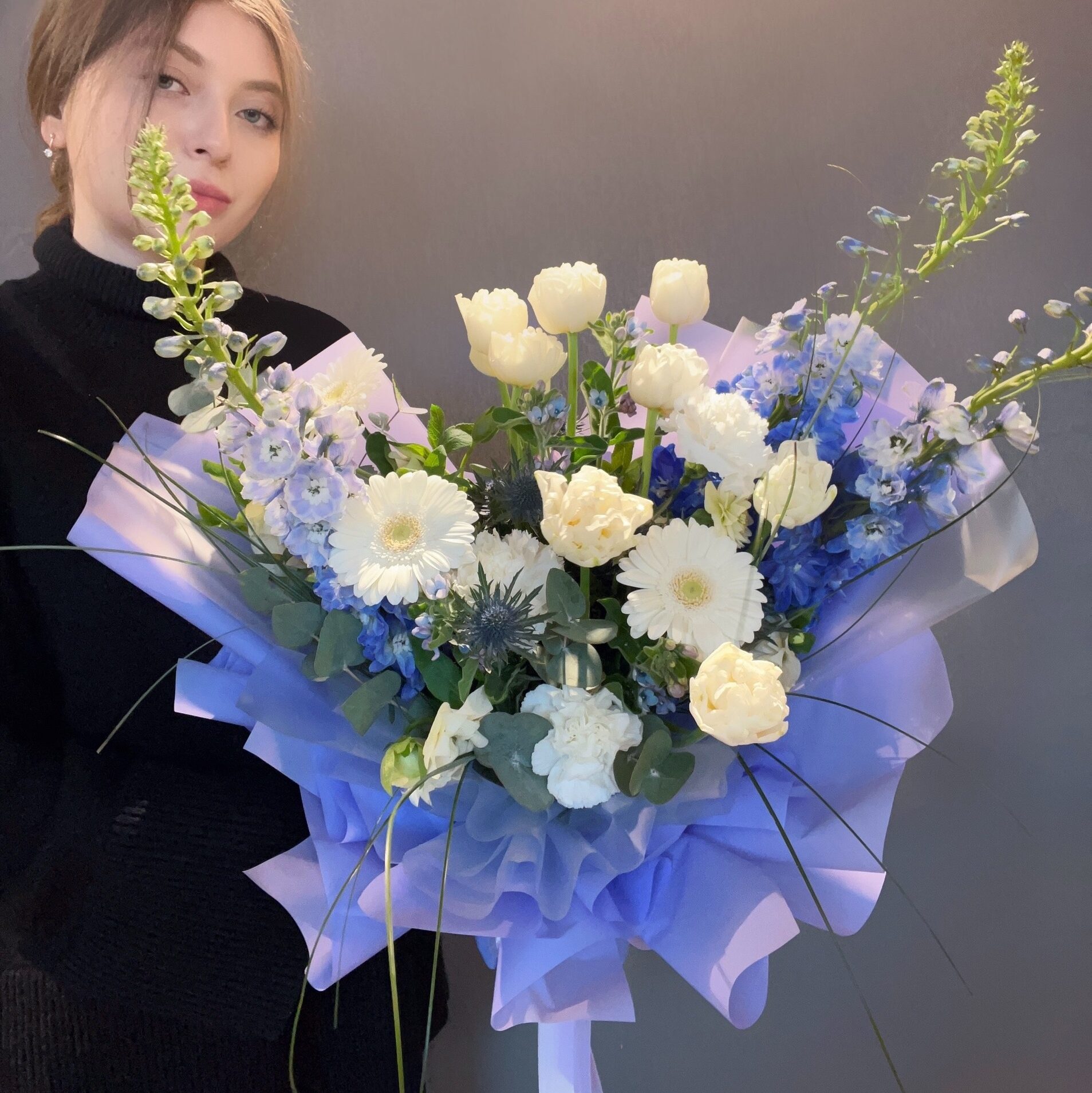 СОСТАВ: ТЮЛЬПАНЫ, ДЕЛЬФИНИУМ,ГЕРБЕРА, ДИАНТУС, ЭВКАЛИПТ, ЭРИНГИУМ, БЕРГРАСС