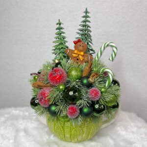 Композиция в чайнике с хвойными ветками, пряничным домиком и декоративными ягодами и леденцами. Удобна для размещения в интерьере и легко сочетается с другими праздничными акцентами. Сохраняет аккуратный вид весь сезон и привносит тёплую, игривую атмосферу зимнего праздника.