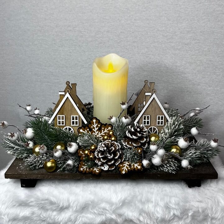 Длинная настольная композиция в кашпо с миниатюрными деревянными домиками и искусственной хвоей. Центральный акцент — свеча на батарейках, безопасная и удобная для использования в любом месте. Отлично подходит для стола, полки или подоконника, создавая тёплую праздничную атмосферу без огня и хлопот.