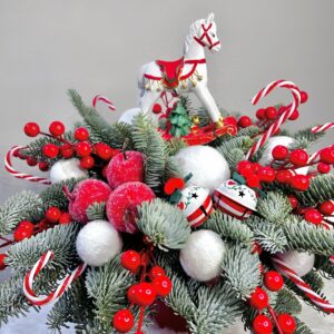 Яркая и праздничная композиция из нобилиса в красной гамме. Декоративные элементы — фигурка коня, ягодные акценты и леденцы — создают атмосферу радости, уюта и зимней сказки.