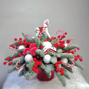 Яркая и праздничная композиция из нобилиса в красной гамме. Декоративные элементы — фигурка коня, ягодные акценты и леденцы — создают атмосферу радости, уюта и зимней сказки.