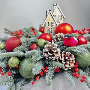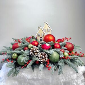 Классическая новогодняя композиция из нобилиса в красно-зелёной палитре. Декоративные шары, миниатюрные домики, ягодные акценты и фигурка снегиря создают ощущение уютной зимней сказки и тёплого домашнего праздника.