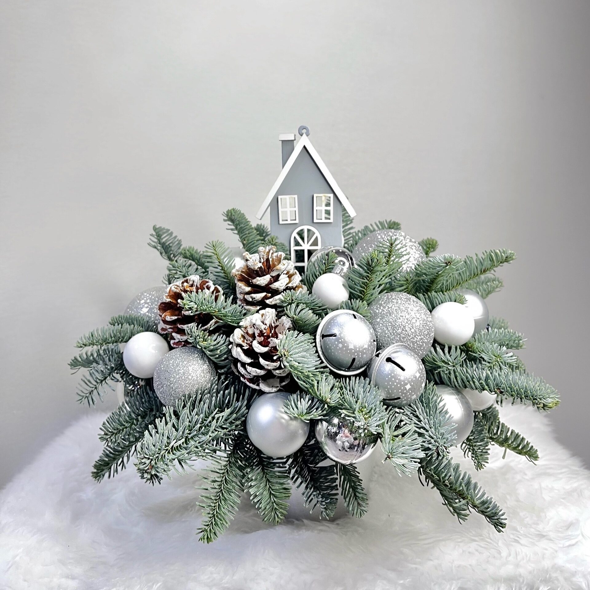 Нежные серебряные оттенки, миниатюрный домик, шишки и елочные игрушки создают атмосферу зимней сказки. Композиция словно замерзшее мгновение праздника — тихое, утонченное и уютное. Идеальна для декора или особенного подарка, который хочется рассматривать снова и снова.