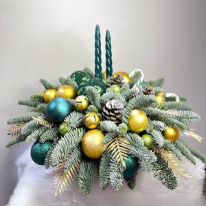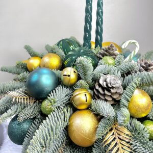 Роскошные зелёные и золотистые оттенки создают гармонию зимнего уюта. Витые свечи, шишки и елочные игрушки превращают композицию в миниатюрный праздничный уголок, где каждая деталь продумана для красоты и настроения. Идеальный акцент для интерьера или изысканный подарок, который дарит радость и атмосферу праздника.