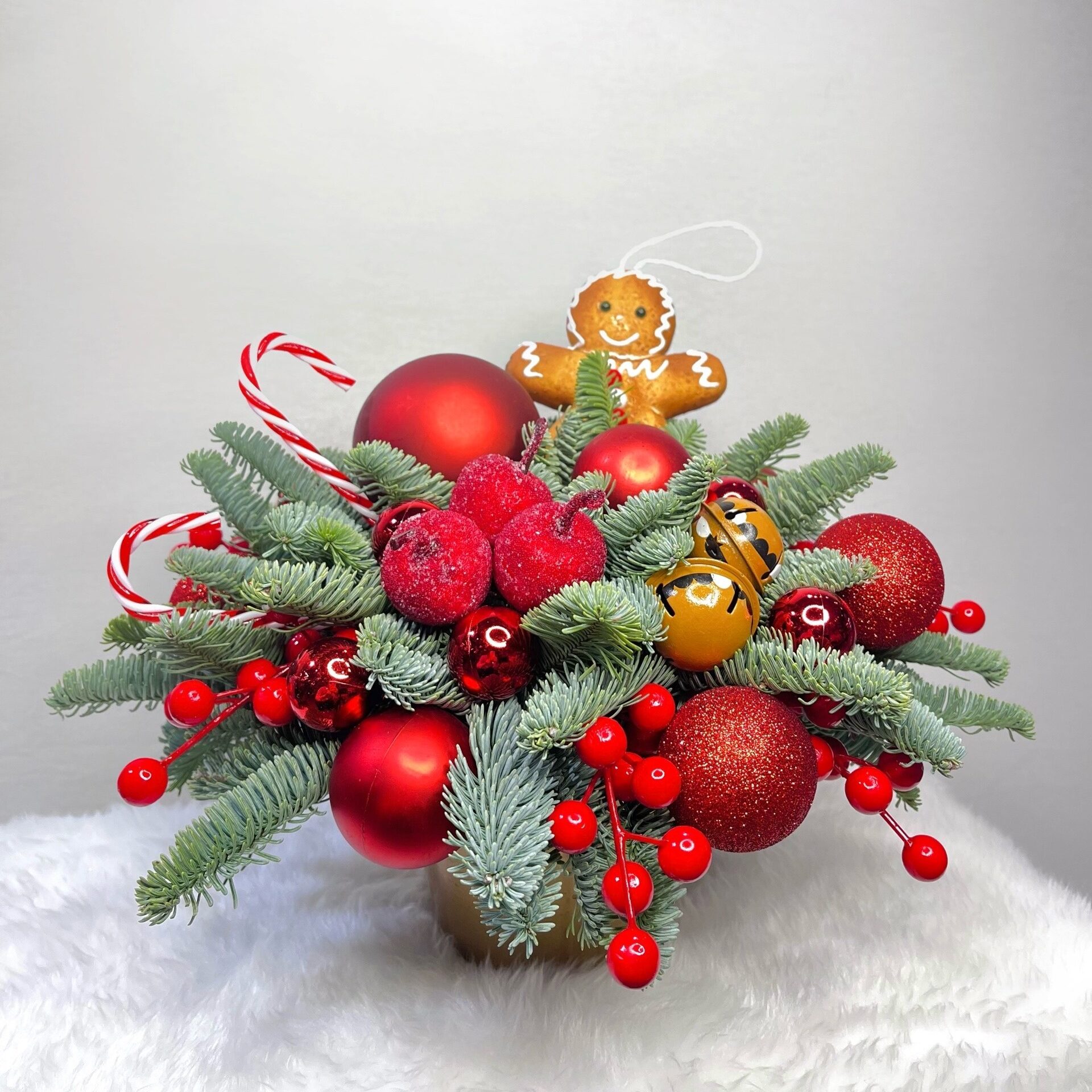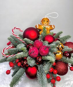 Сочные красные оттенки, пряничный человечек, яркие леденцы, яблоки и ягодки Илекса создают атмосферу настоящего зимнего праздника. Композиция сияет деталями: блеск елочных шаров и уютная пряничная фигурка делают её маленьким сказочным уголком, который дарит радость и тепло.