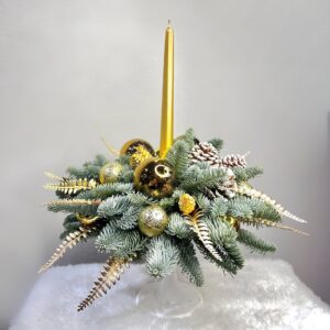 Тёплые золотистые оттенки, блестящие шары, декоративные перья и шишки создают атмосферу роскоши и праздника. В центре — свеча, которая дарит мягкое сияние и оживляет композицию, превращая её в элегантный акцент интерьера. Идеальна для праздничного декора или как особенный подарок, который впечатляет своей детализацией и утончённым стилем.