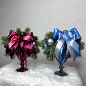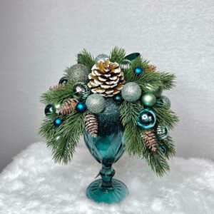 Элегантная настольная композиция в бокале с искусственной хвоей, декоративными шарами и миниатюрными украшениями. Эффектная, создаёт акцент на столе, не занимая много места. Отличный вариант для тех, кто ценит стильный, аккуратный праздничный декор.